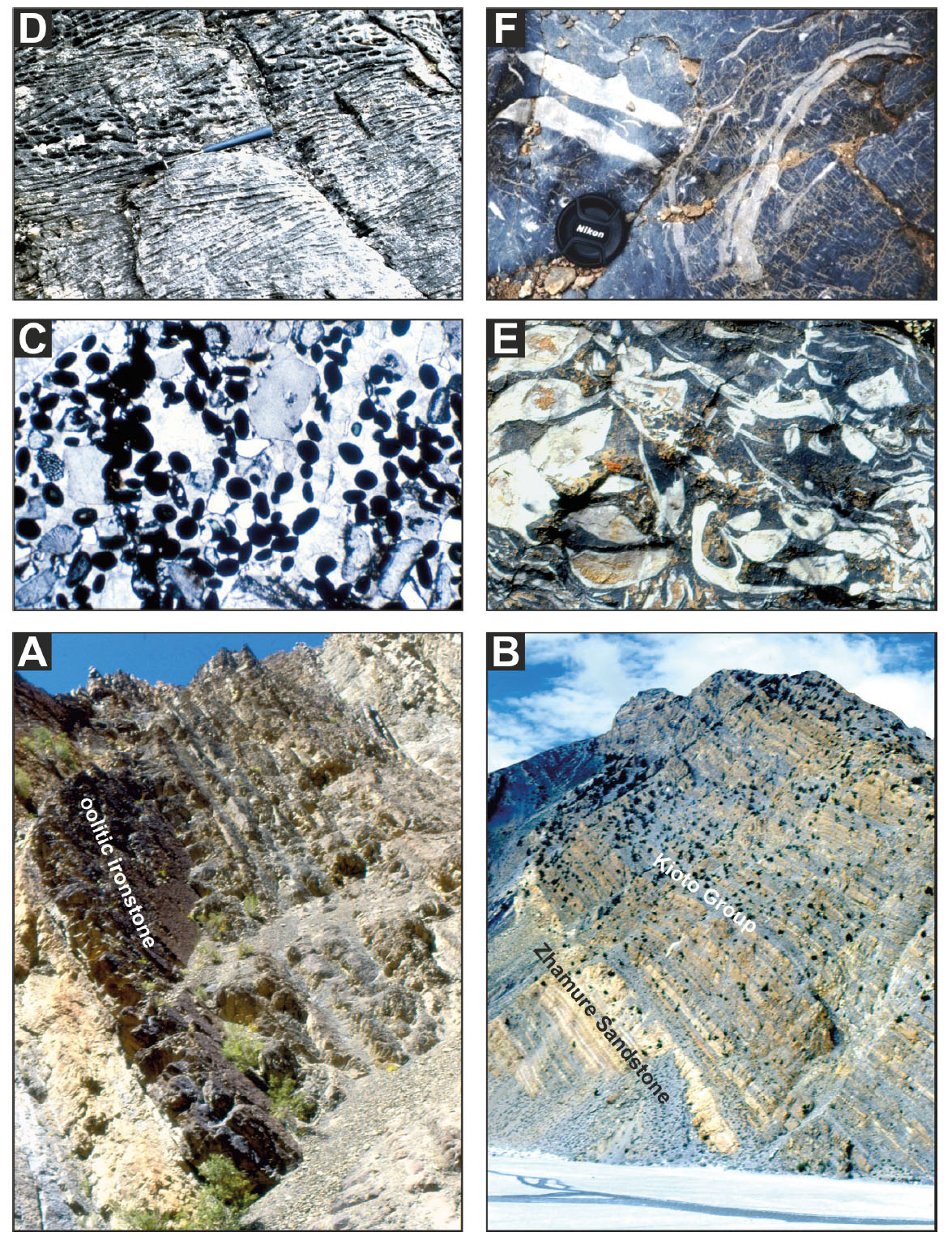 - Upper Triassic “Quartzite Series” and Lower Jurassic Kioto limestones. A) Lower Norian Juvavites Beds with a dark oolitic ironstone layer (lower Alaror Group; Pin Valley, Spiti); B) Sharp boundary between white quartzarenites (topmost Zhamure Sdst.) and Lower Jurassic Kioto Group (Thakkhola, Nepal); C) microphotograph of Norian oolitic ironstone (Zanskar); D) ooidal white quartzarenite marker horizon with tidal herringbone lamination at top of Zhamure Sandstone (Dolpo, Nepal). Limestones rich in Megalodon (E) and Lithiotis (F) characterize lower and upper parts of Kioto Group (Para and Tagling limestones of Stoliczka, 1866).