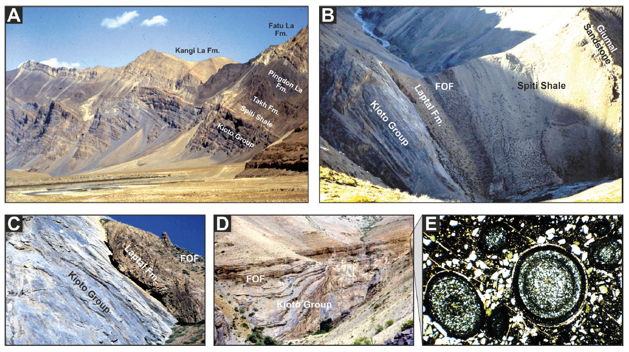 - Middle Jurassic drowning (Zanskar). A) Mesozoic succession from Kioto Limestone to Upper Cretaceous Kangi La Marls. B) Kioto Limestone unconformably overlain by brown Laptal Beds (C; Zumlung Nappe) or directly by Ferruginous Oolite Fm. (D; Zangla Nappe), followed by Spiti Shale capped by Giumal Sandstone. E) Microphotograph of oversized chamosite-goethite ooids with diffuse silica in quartzose silt matrix impregnated by fluorapatite (Ferruginous Oolite Fm.).