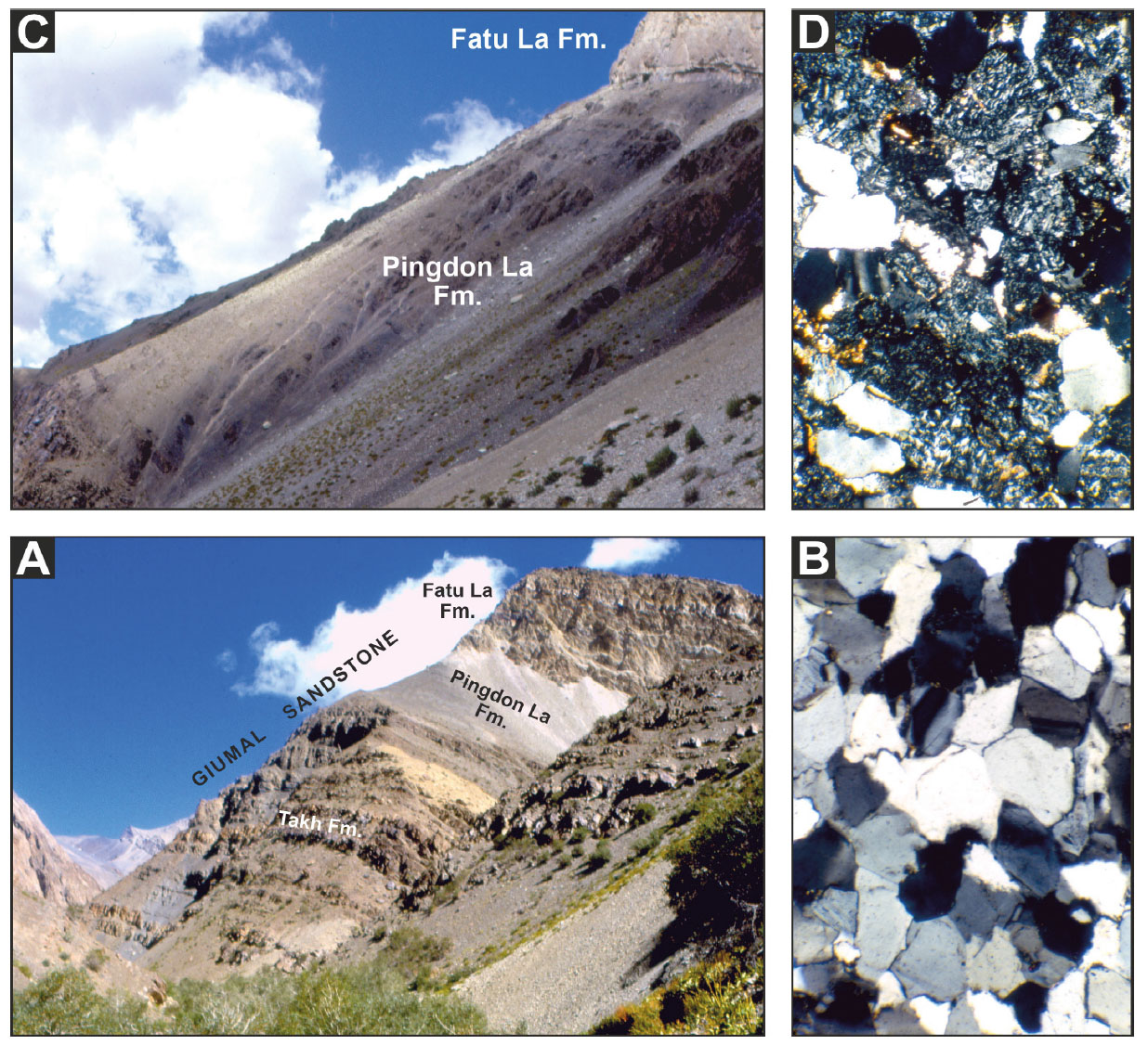- Lower Cretaceous Giumal Sandstone (Zanskar). A) Feldspatho-quartzose to quartzose sandstones of Takh Fm. (B) are overlain by dark grey quartzo-lithic to litho-quartzose volcaniclastic sandstones of Pingdon La Fm. (C) testifying to a major magmatic event (D).