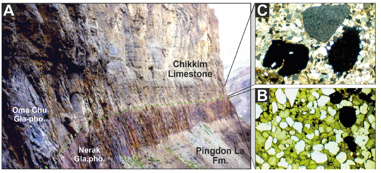 - Mid-Cretaceous drowning (Zanskar). A) Dark volcaniclastic mudrocks at top of Pingdon La Fm. are capped by a dark brown interval of quartz-rich glauconitic greensand (B; uppermost Albian Nerak Glauco-phosphorite), scoured by reworked phosphorites with oversized chert and locally ammonoid-bearing phosphatic lithoclasts set in quartz-rich fine sand (C; uppermost Cenomanian Oma Chu Glauco-phosphorite; basal disconformity dotted in green). Pelagic foraminiferal oozes follow (Turonian-Campanian Chikkim Fm.).