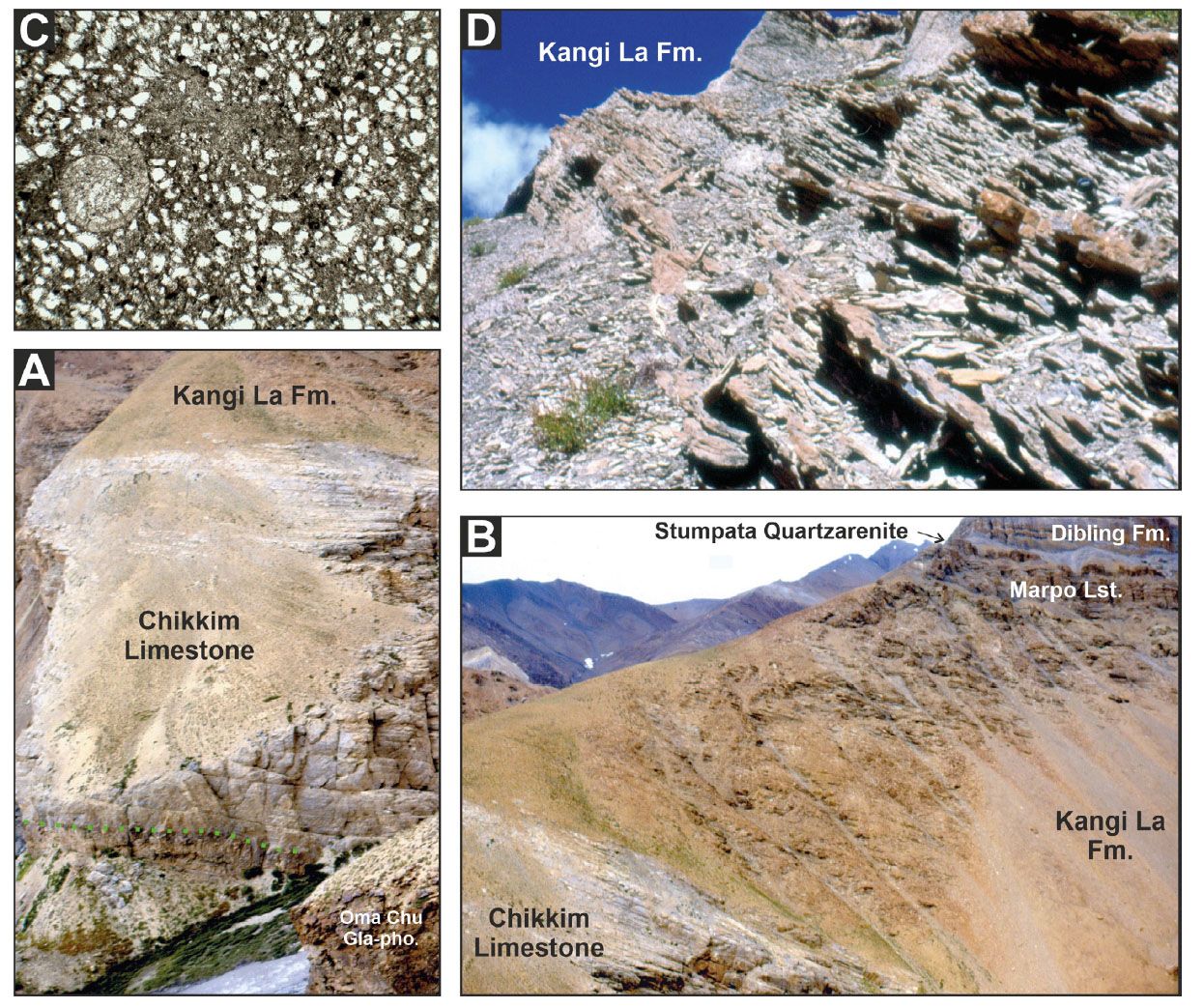- Upper Cretaceous transgressive-regressive sequence. Turonian-Campanian pelagic foraminiferal oozes (A; Chikkim Limestone; basal paraconformity dotted in green) are sharply overlain by the Maastrichtian Kangi La Fm. (B), consisting of marly mudrocks with thin fossiliferous quartz-rich storm layers (C, D). The overlying uppermost Maastrichtian Marpo Limestone is followed by the Danian Stumpata Quartzarenite overlain in turn by the Selandian-Thanetian Dibling Limestone.