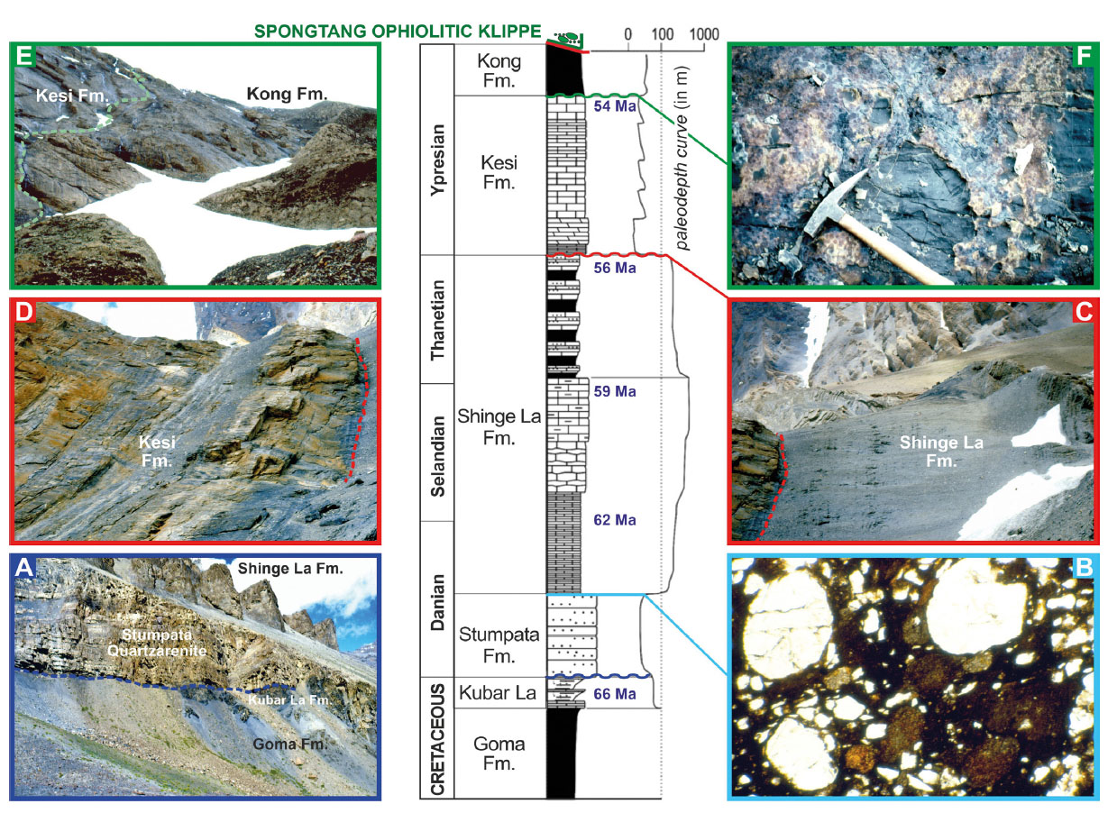 - Syn-collisional stage (Lingshed Nappe, outer margin in the Zanskar Range). A) Outer shelf marls (Goma Fm.) capped by silty marlstones with phosphatic nodules (Kubar La Fm.) are abruptly overlain by pure quartzose beach-barrier sandstones (Stumpata Fm.) documenting a forced regression at the Cretaceous/Cenozoic boundary (dashed blue line). B) Condensed transgressive surface with subrounded and pitted oversized quartz grains set in ferruginous matrix containing brown glaucony peloids (top of Stumpata Fm.). C) Disconformity capping outer shelf marls with planktonic foraminifera (Shinge La Fm.), indicating flexural uplift at the Paleocene/Eocene boundary (dashed red line). D) Lower Eocene Nummulitic limestones overlying the disconformity (Kesi Fm.). E) Onlap of prodelta siltstones (Kong Fm.) onto underlying carbonates marked by a hardground (F; dashed green line). The succession is overthrust by the Spongtang Ophiolite.