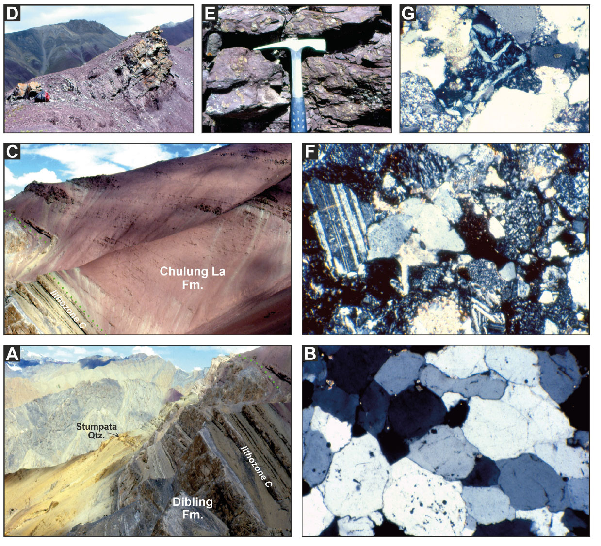 - Post-collisional stage (Upper Zangla Nappe at Dibling; inner margin in the Zanskar Range). A) At the top of the Paleocene carbonate platform, greenish marls intercalated with biocalcarenites (lithozone C of Dibling Fm.) and a lens of pure quartzose sandstone (B) are overlain with low-angle unconformity by the Chulung La redbeds (C). Fluvial channels (D) and interchannel mudrocks with caliche nodules (E) indicate deposition on a subaerial delta plain in semiarid climate. Quartzo-feldspatho-lithic volcaniclastic sandstones (F) contain Cr-spinel and serpentine-schist grains (G) testifying to provenance from the Asian active margin.