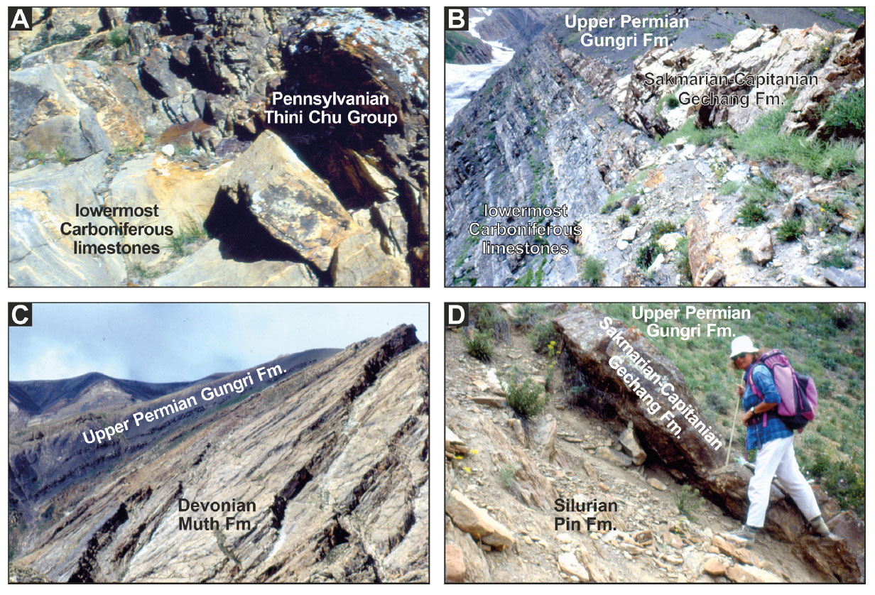 - Rift unconformity. A) lower Tournaisian limestones (Tilicho Lake Fm.) truncated by siliciclastic deposits of the rift sequence in Dolpo (Nepal). The entire rift sequence is missing in central Spiti, where the post-rift Kuling Group onlaps directly onto lowermost Carboniferous limestones in the Pin Valley (B), and onto Devonian Muth Fm. (C) or Silurian Pin Fm. in the Parahio Valley along strike (D; Alda Nicora for scale).