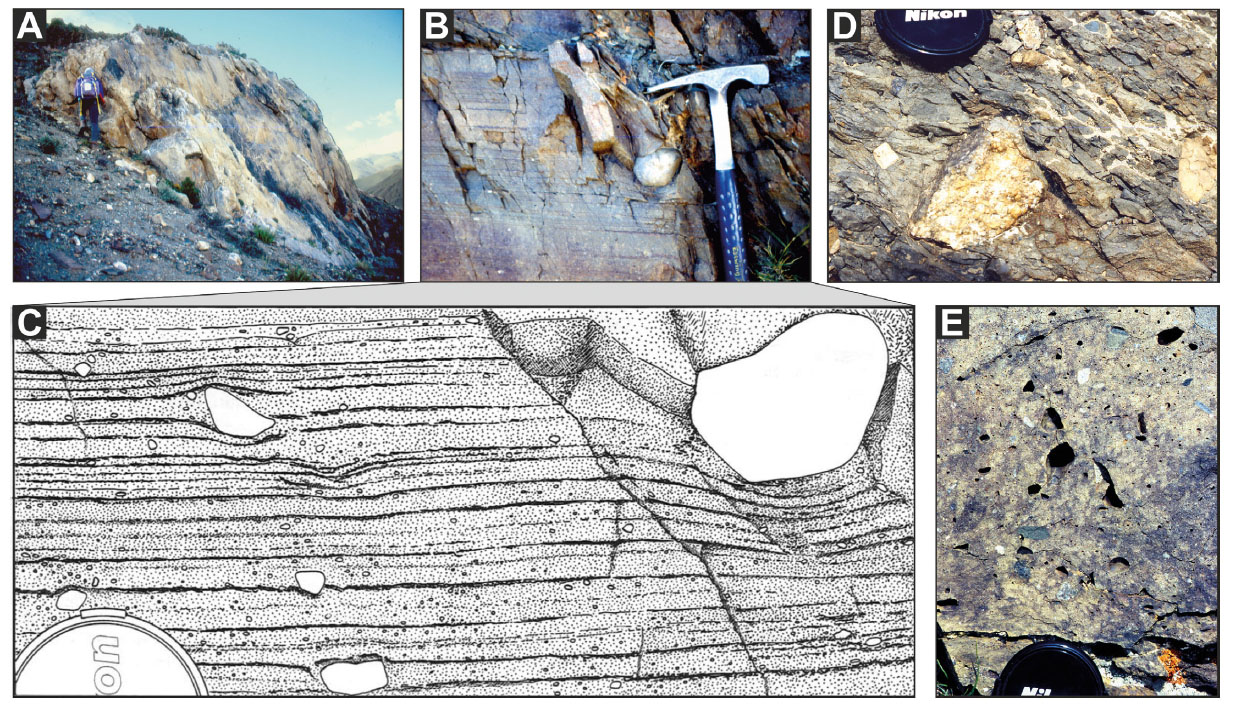 - Gondwanan glaciation (Dzaghar Valley, South Tibet NE of Mt. Everest). Lower Carboniferous tillites contain boulders up to 32 m in diameter (A; Fabrizio Berra for scale). B, C) Varved siltstones displaying thin seasonal laminae disturbed by sparse ice-dropped pebbles. D, E) Unsorted pebbles locally showing trapezoidal flat-iron shape.