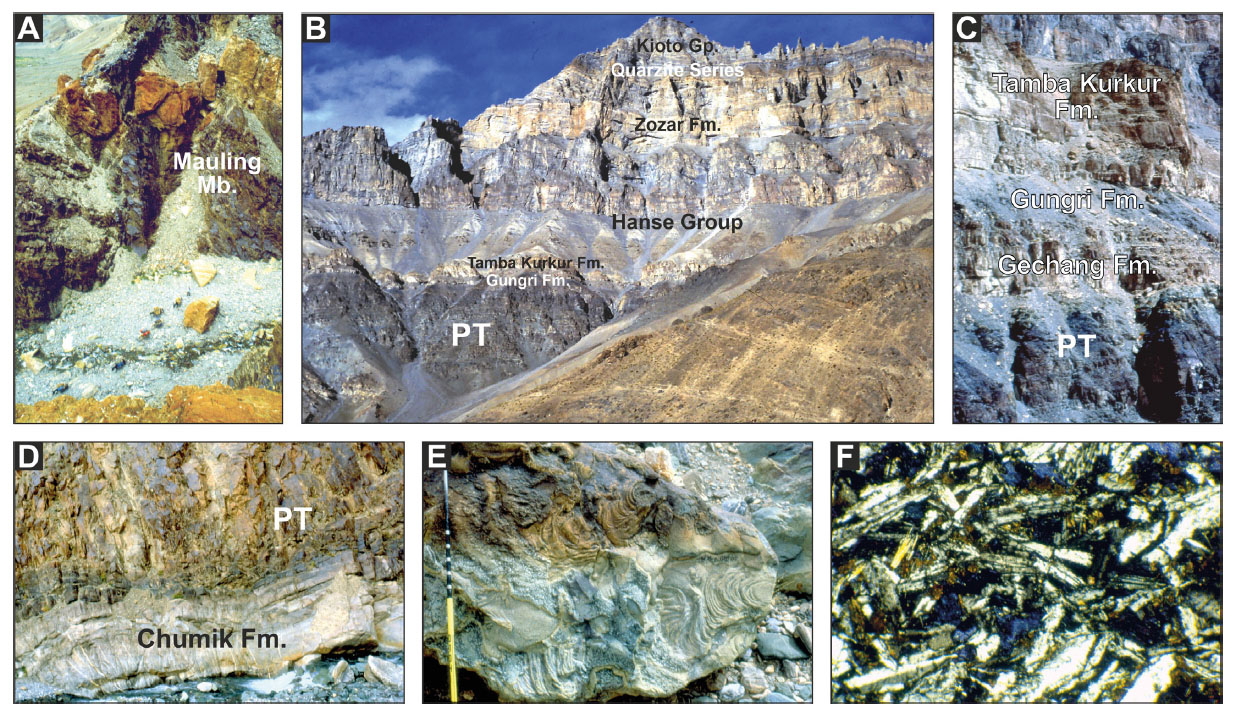 - Panjal Traps (PT; Zanskar). A) Basaltic feeder dike (“Baralacha La dyke swarm”; Vannay & Spring, 1993) cutting across an orange dolostone bed (lower Cambrian Mauling Member of Karsha Fm.). B) Basaltic lavas overlain by upper Permian-Triassic passive-margin strata. C) Sharp upper contact of basalts with upper Permian Kuling Group overlain by Lower Triassic Tamba-Kurkur Fm. D) Abrupt base of basalts overlying lower Permian feldspatho-quartzose sandstones (Chumik Fm.). E) Pāhoehoe lava flow. F) Microphotograph of fluidal texture with oriented plagioclase laths and patches of secondary bluish chlorite.