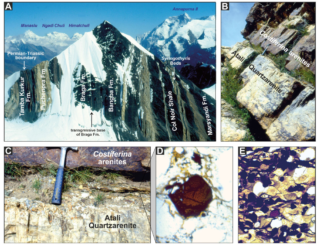 - From rift to drift. A) Carboniferous to Lower Triassic succession in Manang (Nepal; Mansiri Himal and Annapurna ranges are seen in the background to the left and right of the Dent Permienne; Bordet et al., 1975). B, C, D) Breakup unconformity mantled by a thin rippled layer containing brown Cr-spinel in Dolpo (Nepal). E) Glaucony-rich greensand enriched in ultradense minerals including black Fe-Ti-Cr oxides and brown Cr-spinel mantles the breakup unconformity in Zanskar.