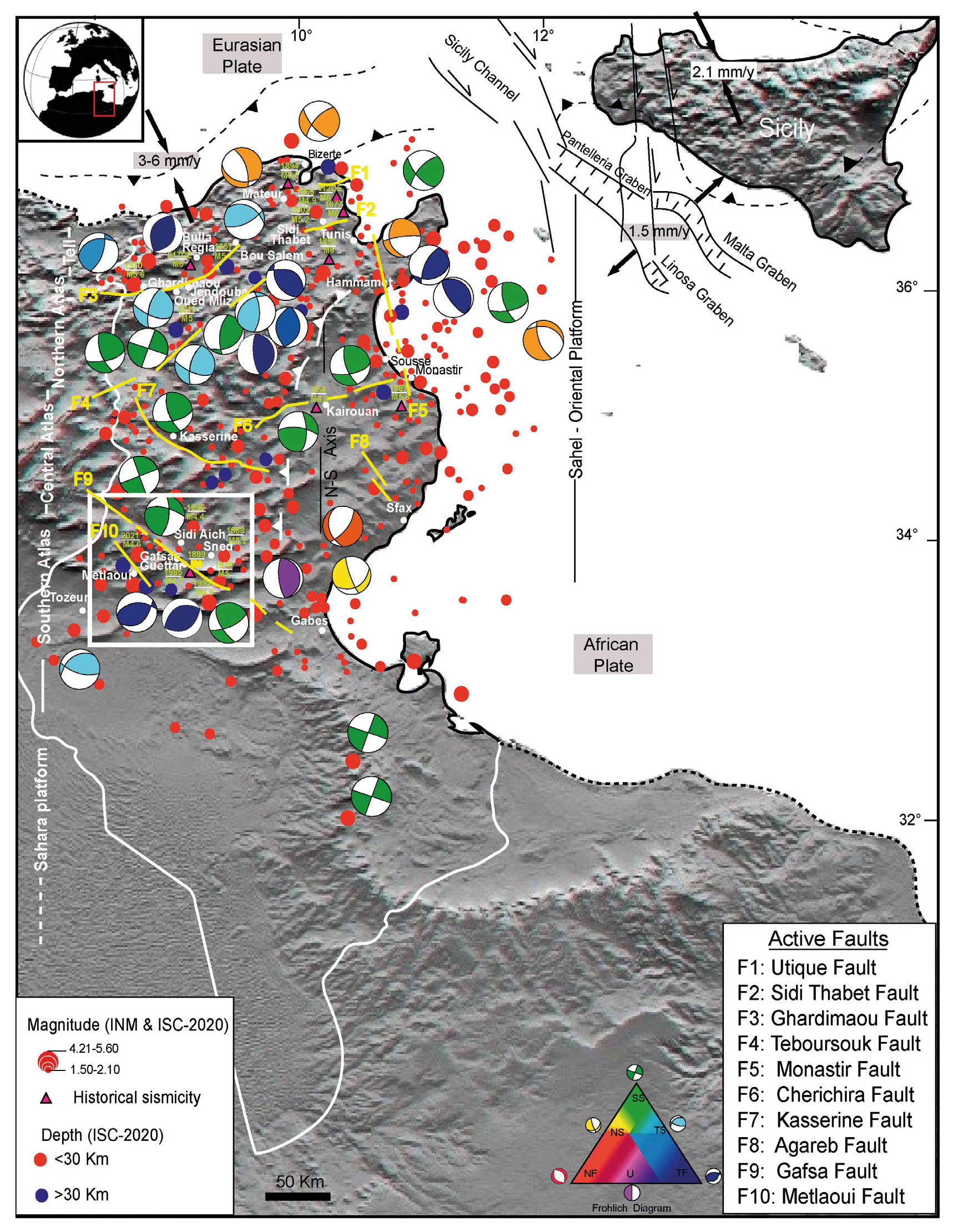 - Simplified tectonic map of Tunisia. Active faults are mapped from Tunisian geological maps (modified after Dlala & Hfaiedh, 1993; Boutib & Zargouni, 1998; Bouaziz et al., 2002; Soumaya et al., 2016). Dots indicate instrumental seismicity data compiled from the Institut National de la Météorologie-Tunisia (INM) catalogue and the International Seismological Centre (ISC) bulletin, colour-coded with according to epicentre depths. Historical earthquakes with estimated magnitudes, shown as coloured triangle, are reported from Kharrati et al. (2018). Focal mechanisms are sourced from INM, RCMT, and ETHZ. The Frohlich diagram categorizes fault types as follows: NF (Normal Fault), NS (Normal-Sinistral), TF (Thrust Fault), SS (Strike-Slip Fault), TS (Thrust-Strike), and U (Undefined). The white box highlights the study area shown in Figure 2. The base map is a shaded DEM map (SRTM) with a 30m grid-size.