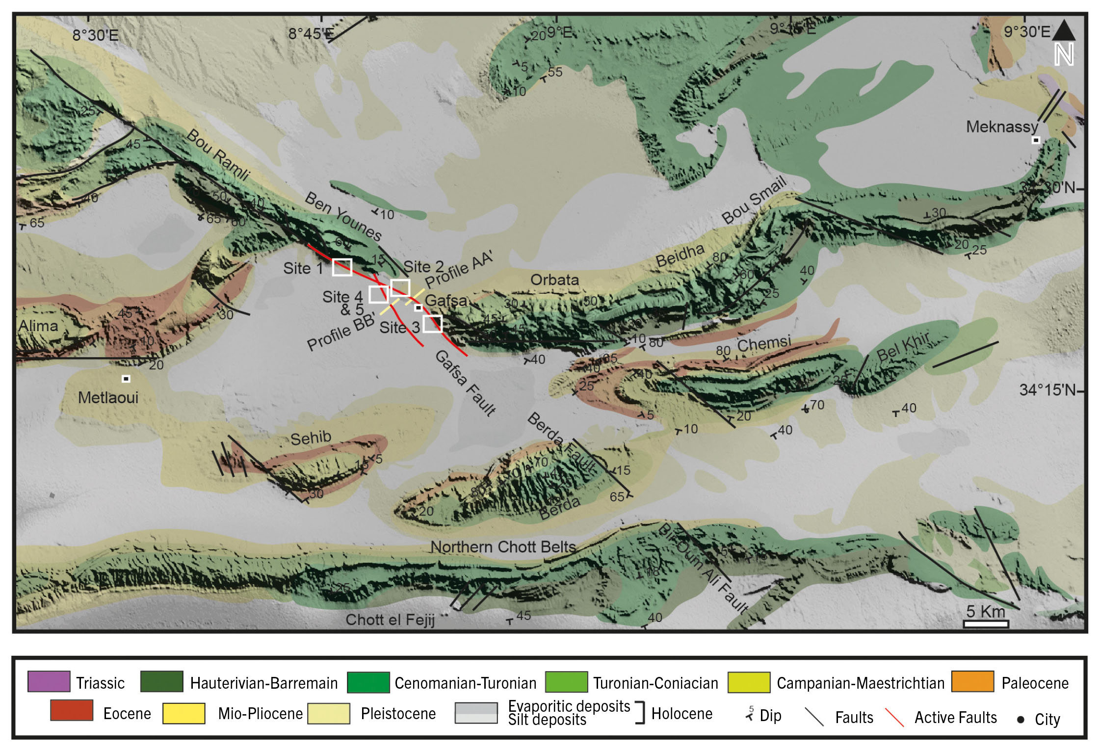 - Geological map of the Southern Atlas (adapted from the 1:500,000 scale geological map of Tunisia (Geological Survey of Tunisia, 1985; Slimane et al., 1991; Ben Youssef, 1999; Gallala et al., 2009). The background features a 90m DEM from ALOS World 3D (Takaku et al., 2014). Red lines are the active Gafsa Fault system. Black circles represent towns. White boxes outline the investigated sites. Traces of the profiles AA’ and BB’ given in Fig. 7 are indicated.