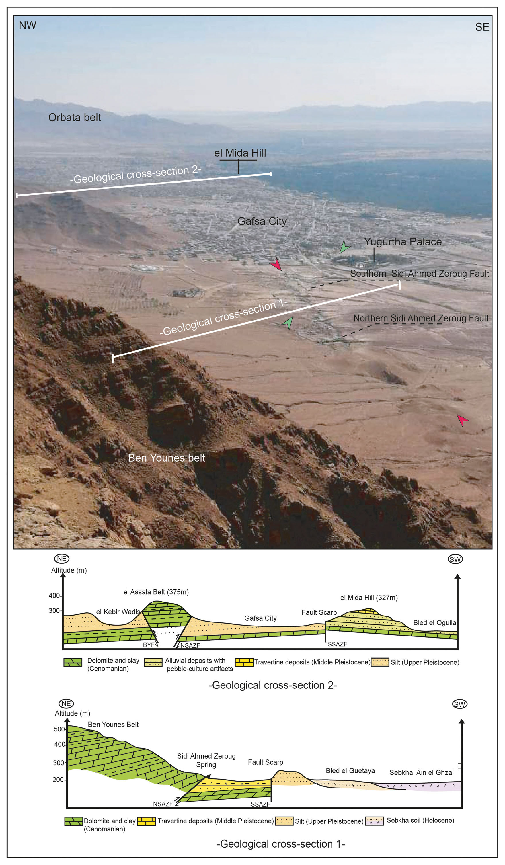 - Geological cross-sections through the Gafsa Faulted Zone, illustrating the structural configuration and segmentation of the North and South Sidi Ahmed Zeroug Faults (NSAZF and SSAZF).