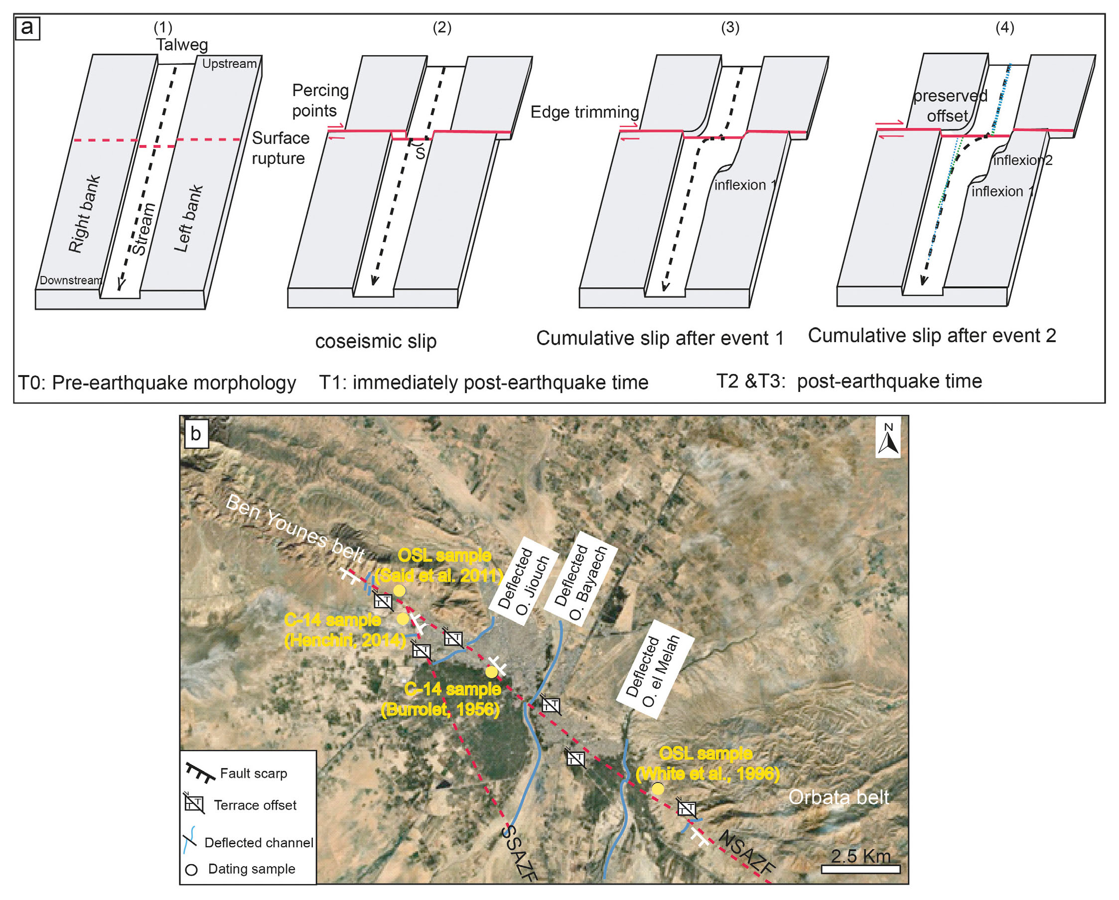 - (a) Schematic representation of channel geometry showing lateral displacement (modified from Guo et al., 2021). (1) The channel riser sections on both banks, along with the linearity of the stream, provide the best basis for estimating lateral displacements. (2) Coseismic deformation occurs along a right-lateral strike-slip fault (red lines). The amount of slip (S) is estimated using piercing point method. (3) Post-earthquake morphology is influenced by ongoing sedimentation and erosion processes. Note that displacement measurements on the left bank may be underestimated due to erosion at the offset corner. The eroded material contributes to the formation of an inset terrace. Therefore, it is more reliable to measure displacement using the riser on the right bank. (4) Inflexions observed on the left bank result from cumulative offsets across multiple seismic events. The most recent event corresponds to the inflexion near the fault. (b) Map showing the location of displaced geormorphic markers and dated terraces relative to the Gafsa fault strands.