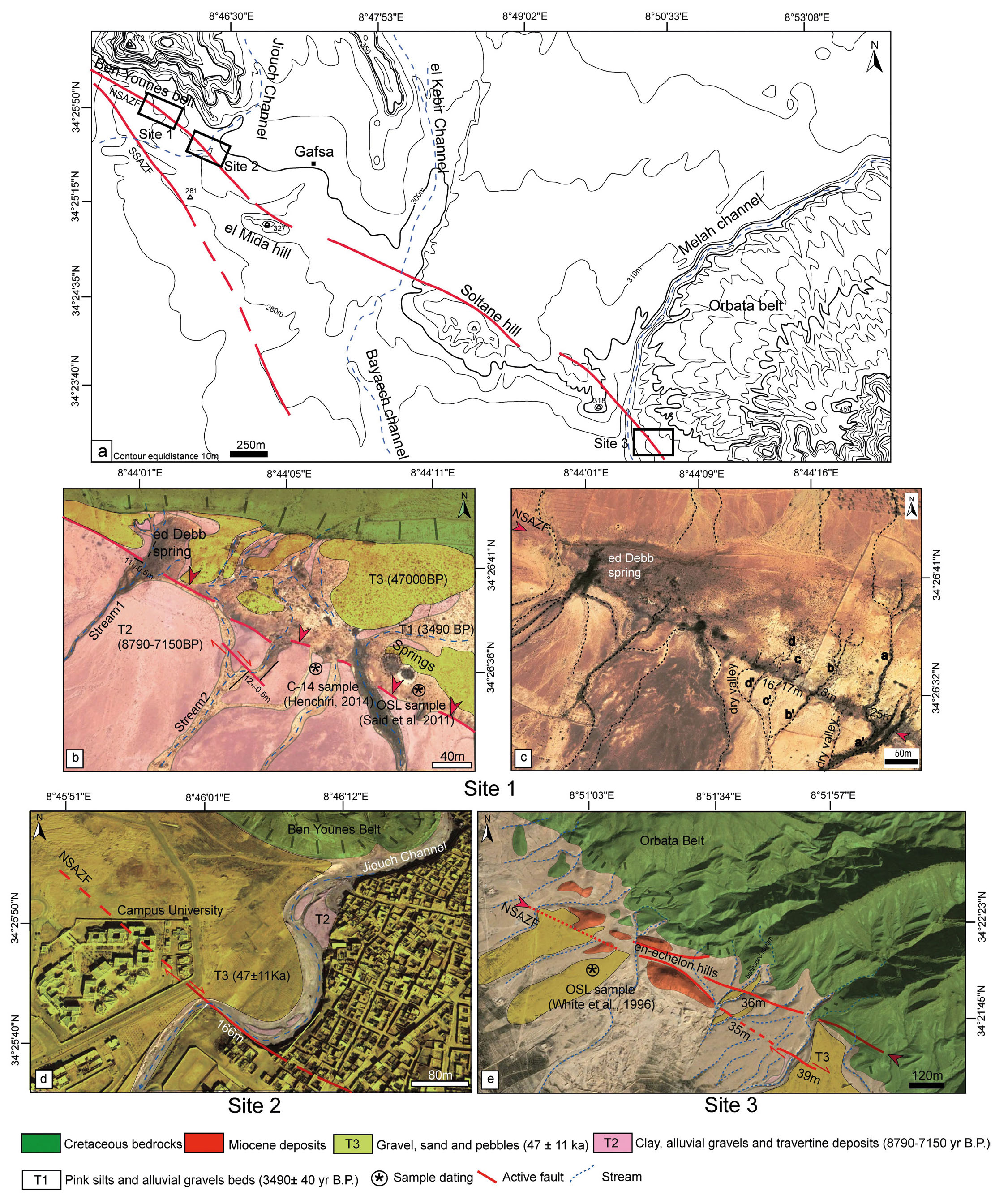 South of the Bayaech channel, extending to the northwestern edge of the Ben Younes Belt and reaching Gafsa town, the NSAZF exhibits a well-defined trace that distinctly separates the Ben Younes Belt from the Sidi Ahmed Zeroug Basin. This fault dissects several streams that flow southward along the gentle slopes of Ben Younes, where well-developed alluvial fans and fluvial terraces are present. Each terrace is characterised by distinct sedimentary facies and topographical features. Moving away from the Ben Younes Belt and toward the south, we identified three primary terrace levels: Terrace 3 (T3), the oldest terrace, is composed of gravel, sand, and pebbles, with an OSL age of 47 ± 11 ka (White et al., 1996); Terrace 2 (T2) is characterised by clays and alluvial gravels, capped by travertine deposits dated to 8,790 ± 50 and 7,150 ± 70 BP (Henchiri, 2014); Terrace 1 (T1), the youngest terrace, consisting of pink silts and green clays, capped by a calcrete layer, dated to 3,490 ± 40 BP (Said et al., 2011).
