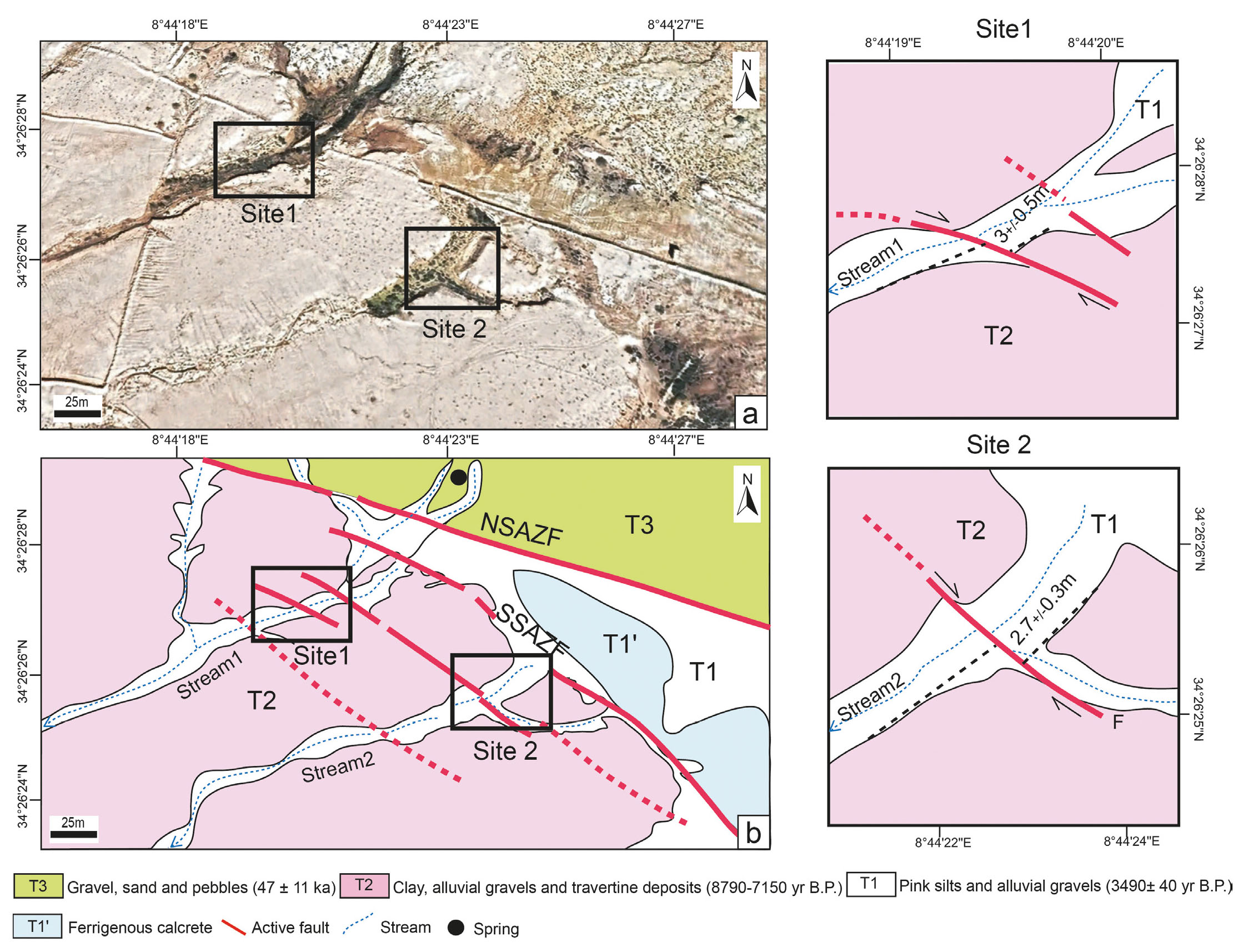 The study site is located near Hotel Yugurtha Palace, approximately 2 kilometers northwest of Gafsa town. The southern strand of the fault is oriented at N140°E, differing from the northern segment of the Gafsa Fault. The angle between these two branch faults is approximately 10-20°. The right-lateral strike-slip system appears to extend further south of Gafsa town. In this faulted area, streams are generally longer and steeper on the upstream block, with greater valley incision. At least three springs have been identified, contributing to the development of a swampland landscape and a fault trough. In this section of the SSAZF, as shown in Figure 6a, we estimated the strike-slip rate across the fault zone. Along its weathered trace, terrace risers serve as geomorphic markers, though their imprints in the topography are subtle, making offset measurements challenging. Based on field investigations, the upstream and downstream segments of the streams run perpendicular and slightly oblique to the fault trend. The T2/T1 riser on the left banks of streams 1 and 2, located near the fault, is well preserved and records a Holocene lateral offset of 2.7-3 meters (Fig. 6b).