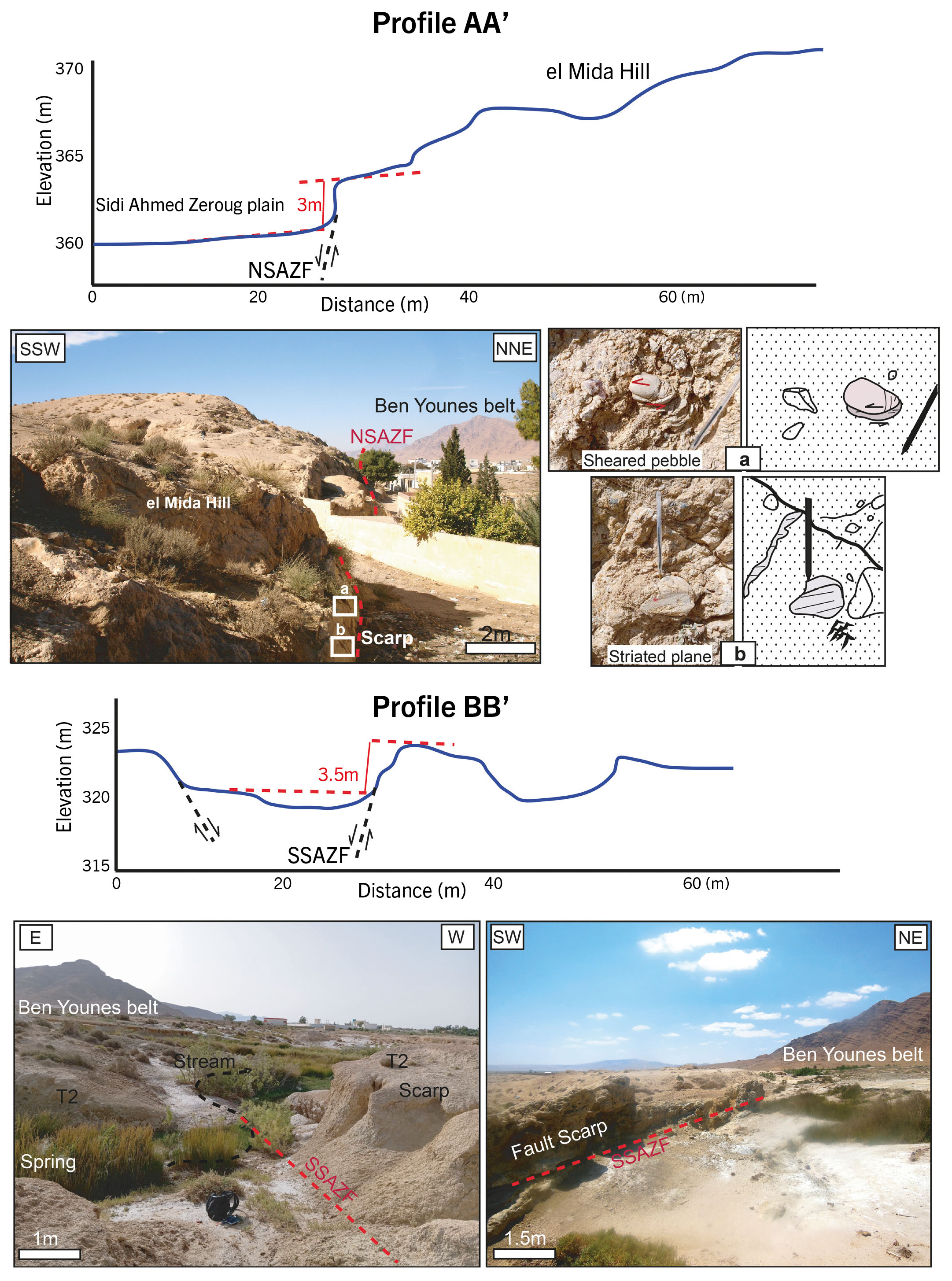 - Topographic profiles drawn along the Gafsa Fault system. Profile AA’ crosses the NSAZF that cuts the el Mida hill. Its fault scarp displays dextral movement. Profile BB’ crosses the SSAZF.