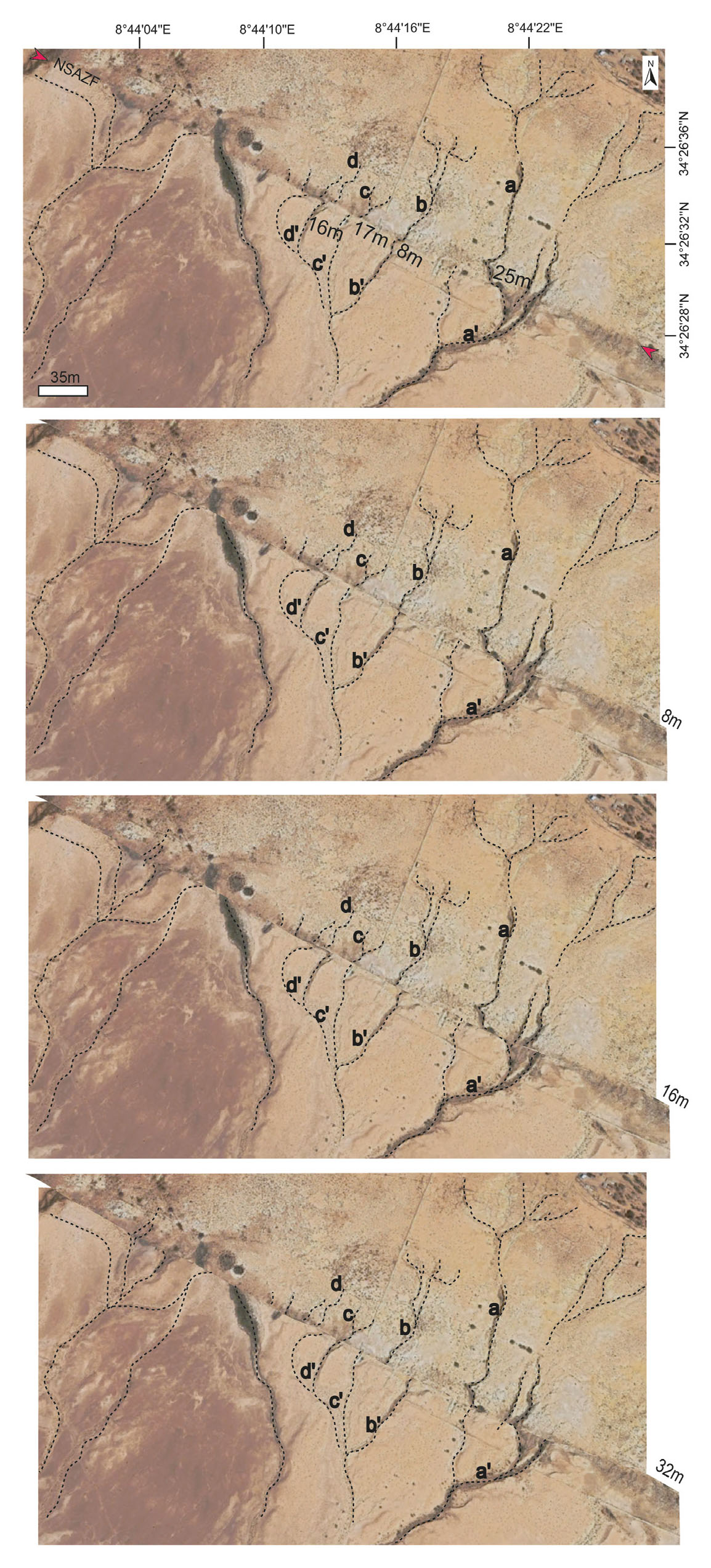 - Restoration of slip along the North Sidi Ahmed Zeroug Fault using the back-slipping method. Drainage channels labeled a-d were analyzed for cumulative displacement. A back-slip of 8 meters brings streams b/b′ into approximate alignment. Similarly, a displacement of 16 meters realigns streams c/c′ and d/d′. Stream a/a′ regains its pre-faulting morphology with a total back-slip of 32 meters.