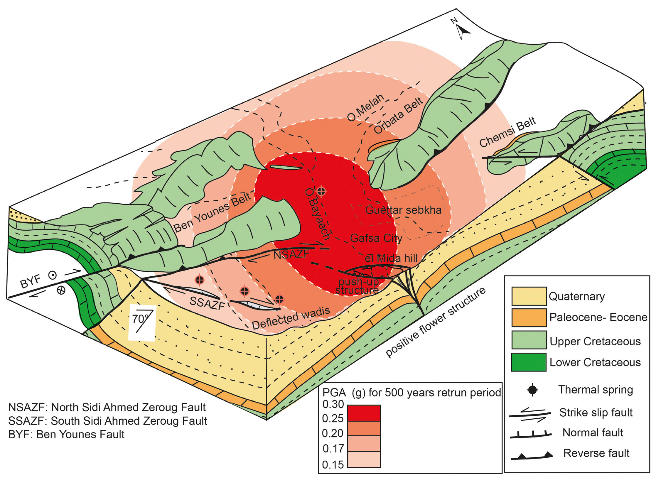 - The three-dimensional structural deformation characteristics of the Gafsa Fault system. BYF refers to the Ben Younes Faults; NSAZF and SSAZF correspond to the North and South Sidi Ahmed Zeroug Faults, respectively. A probabilistic seismic hazard model for the Gafsa region illustrates the Peak Ground Acceleration (PGA) for a 500-year return period, expressed as a fraction of standard gravity (g), modified from Soumaya et al. (2016).
