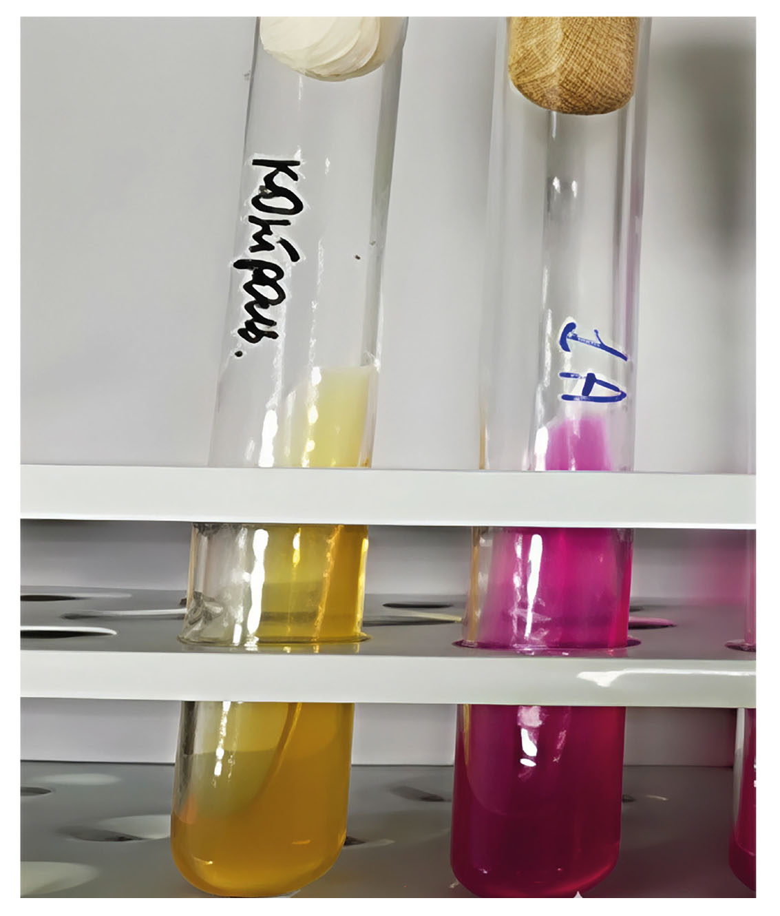 - The growth of the isolate in the Christensen environment. On the left – control; on the right – a positive result reflecting the presence of urease activity of the isolate.