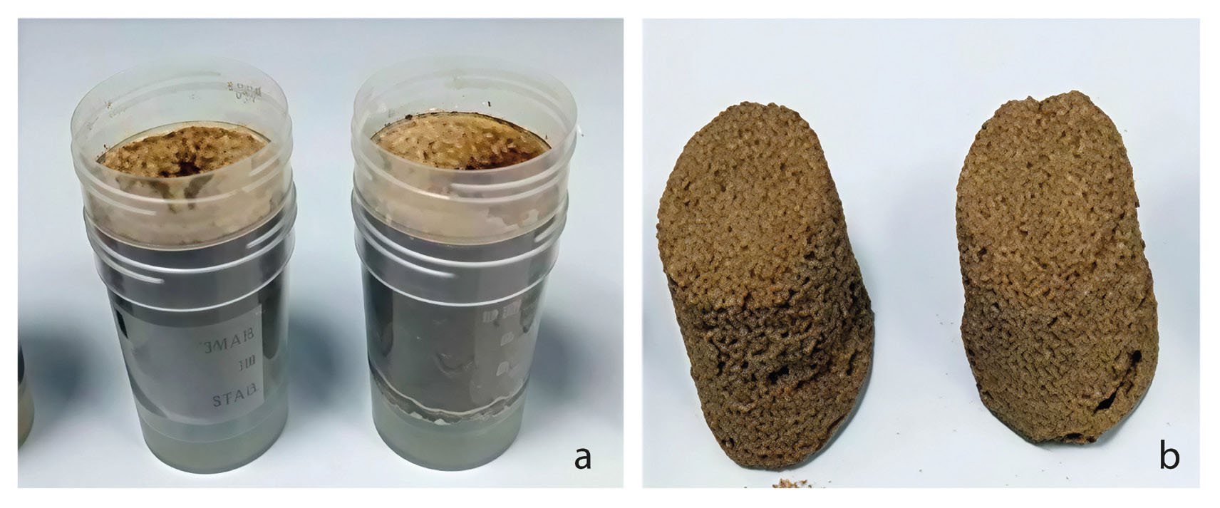 - Biocementation: a) biocementation process, b) biocementation result.