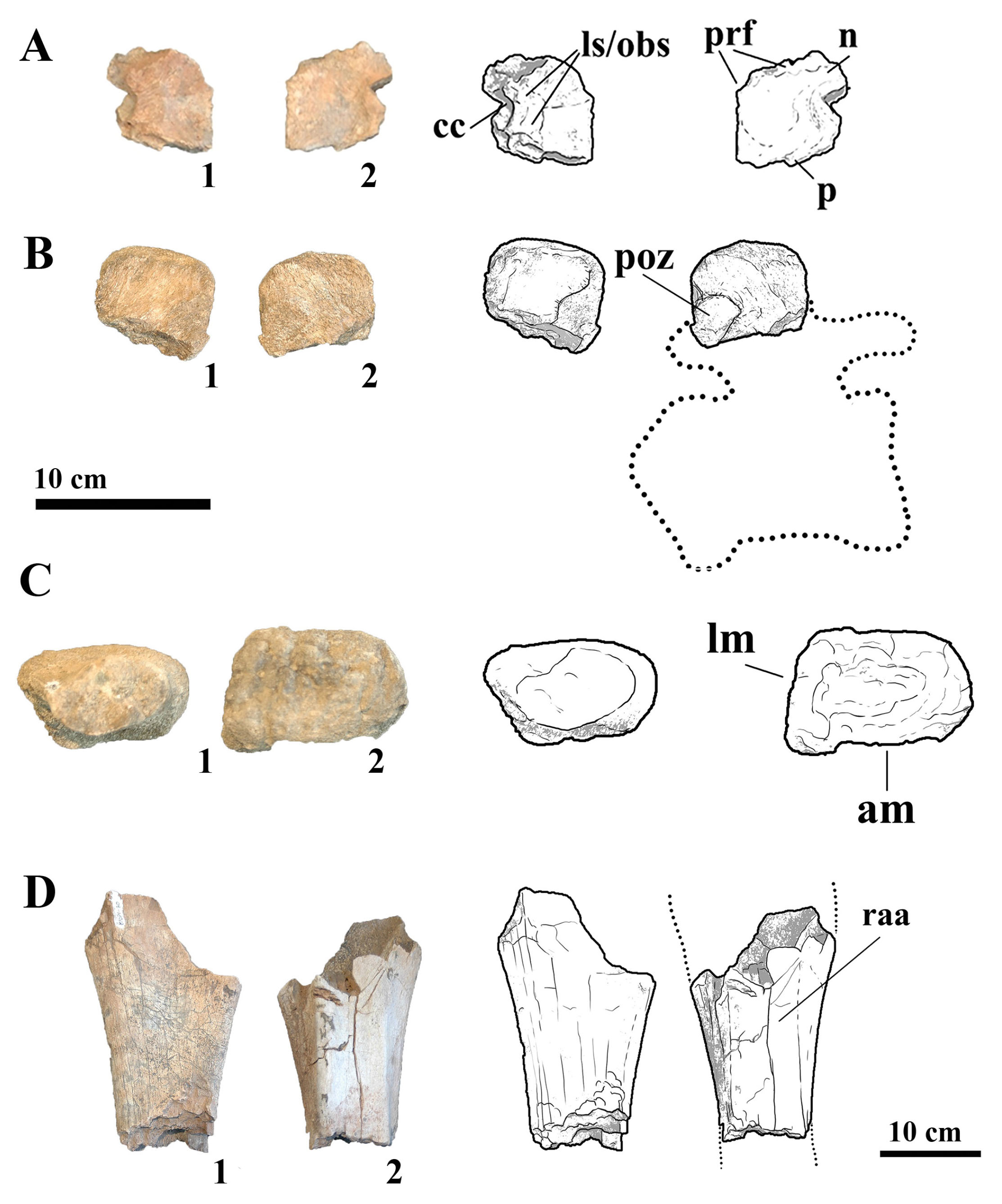 - (A) Photographs and line drawings of left frontal MMS-PV-77 in (1) dorsal and (2) ventral views. Abbreviations: cc, cranial cavity; ls/obs, laterosphenoid/orbitosphenoid suture; n, nasal facet; p, parietal facet; pfr, prefrontal facet. (B) Photographs and line drawings of neural spine MMS-PV-78 in (1) left and (2) right views. Abbreviations: poz, postzygapophyses. (C) Photographs and line drawings of IV right metacarpal MMS-PV-79 in (1) proximal and (2) distal views. Abbreviations: am, anterior margin; lm, lateral margin. (D) Photographs and line drawings of ulna MMS-PV-80 in (1) medial and (2) lateral views. Abbreviations: raa, radial articulation.