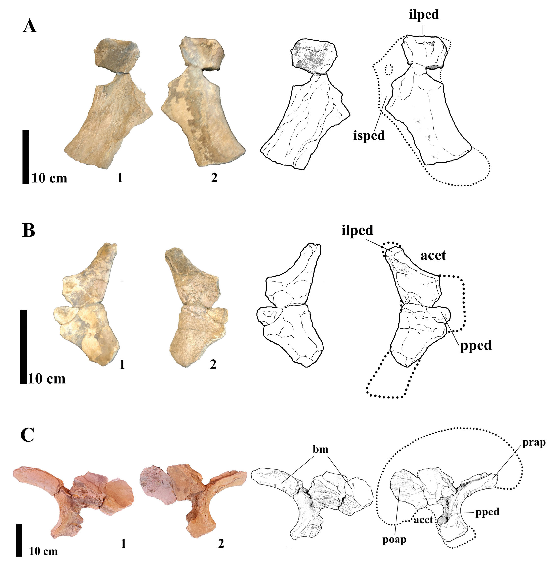 - (A) Photographs and line drawings fragmented right Ischium MMS-PV-82/01 in (1) medial and (2) lateral views. Abbreviations: ilped, iliac peduncle; isped, ischiatic peduncle. (B) Photographs and line drawings of fragmented right pubis MMS-PV-82/02 in (1) medial and (2) lateral views. Abbreviations: acet, acetabulum; ilped, iliatic peduncle; isped, ischiatic peduncle. (C) Photographs and line drawings of fragmented left ilium MMS-PV-82/03 in (1) lateral and (2) medial views. Abbreviations: acet, acetabulum; ft, feeding traces; poap, postacetabular process; pped, pubic peduncle; prap, preacetabular process.