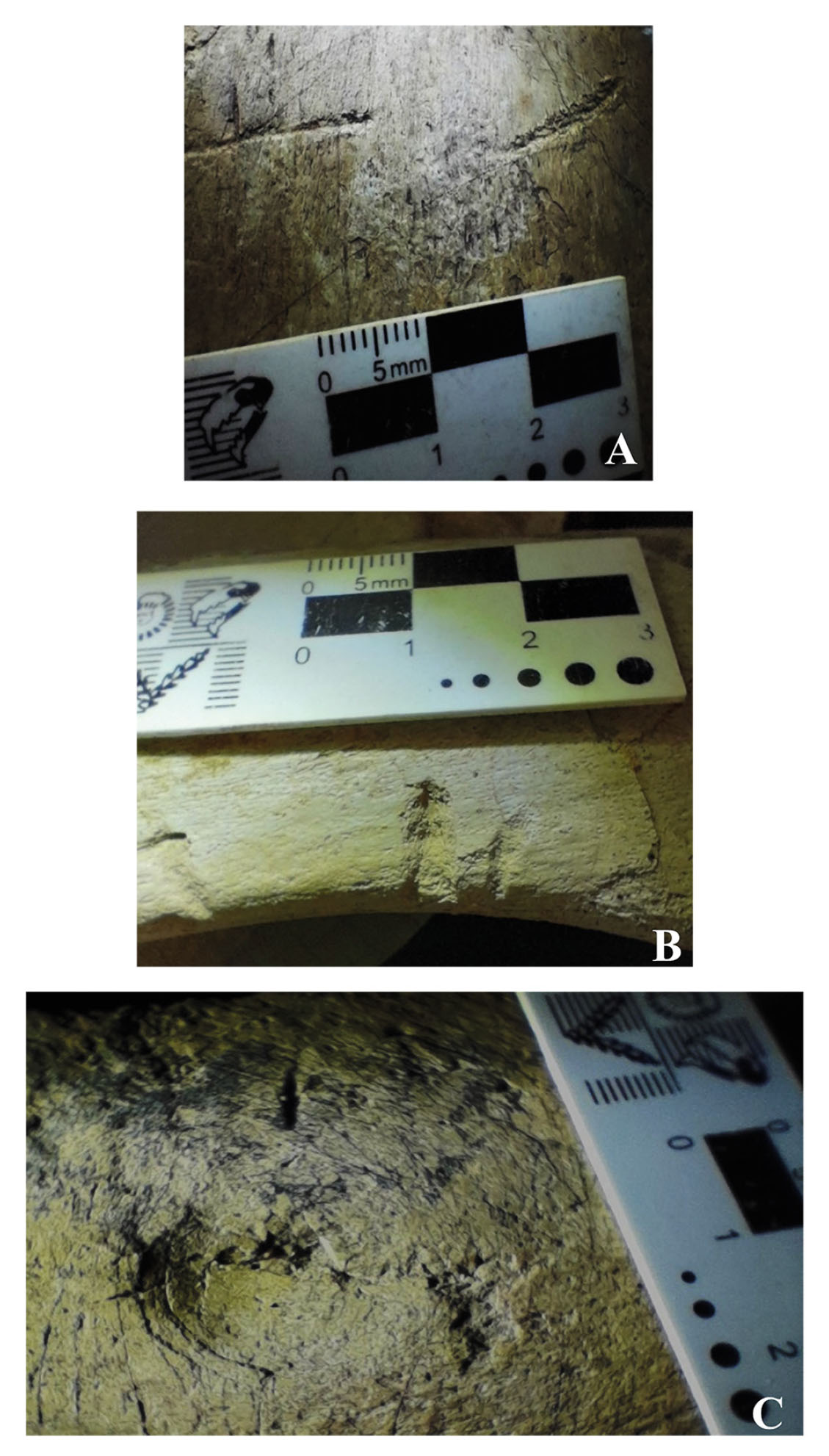 - Feeding traces found on MMS-PV-82/03 interpreted as score marks (A), furrows (B) and a pit (C).