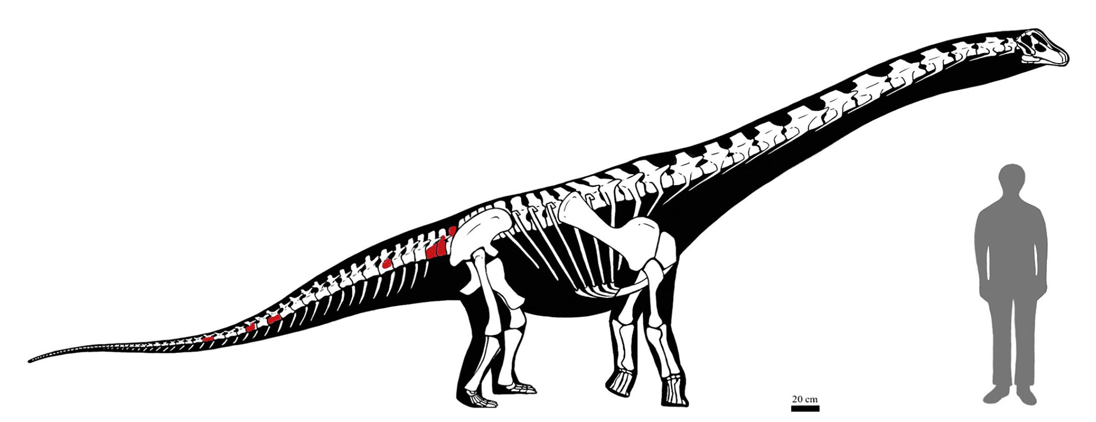 - Reconstruction of specimen MMS-PV-75 alongside a 185 cm tall human figure, based on the skeletal elements recovered and described in this study (highlighted in red), and supplemented through comparative analysis with morphologically similar titanosaurian clades, including Rinconsauria and Aeolosaurines. Paleoart by Riccardo Serena de Maria.