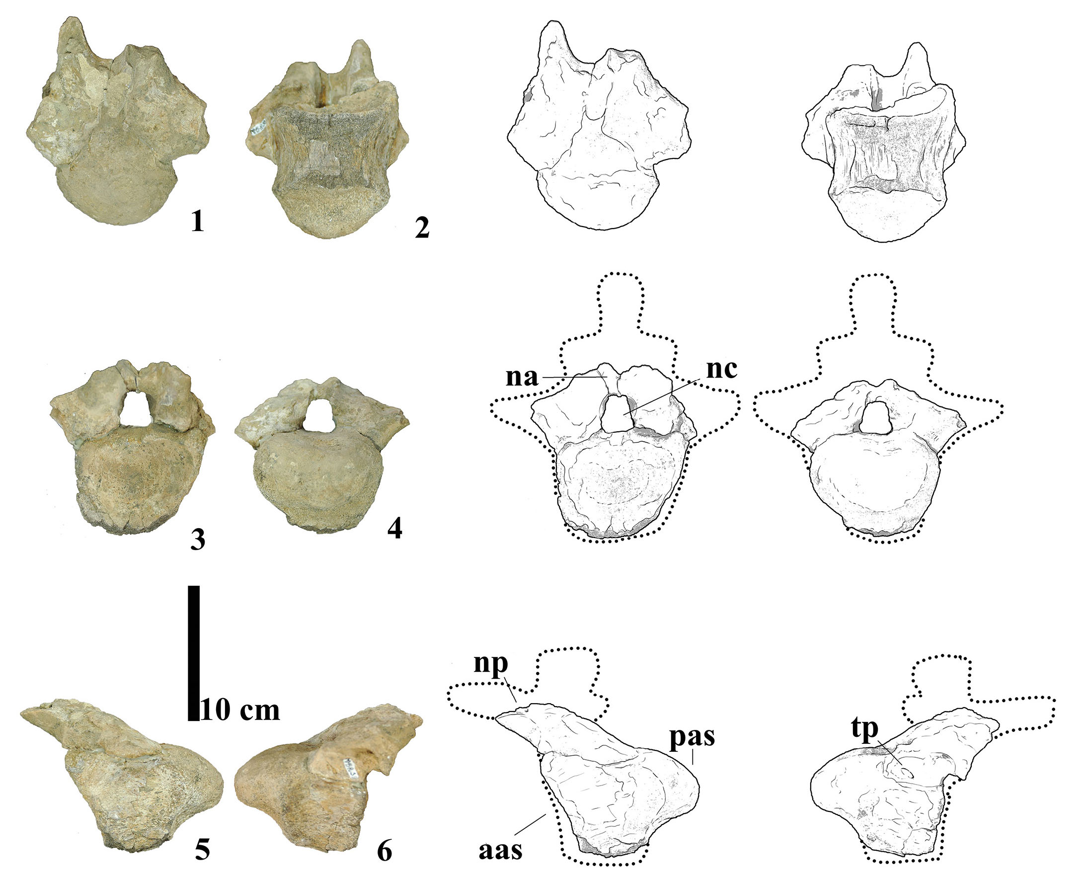 - Photographs and line drawings of caudal vertebra MMS-PV-39 in (1) dorsal, (2) ventral, (3) anterior, (4) posterior, (5) left and (6) right views. Abbreviations: aas, anterior articular surface; na, neural arch; nc, neural canal; np, neural pedicels; pas, posterior articular surface; tp, transverse process.