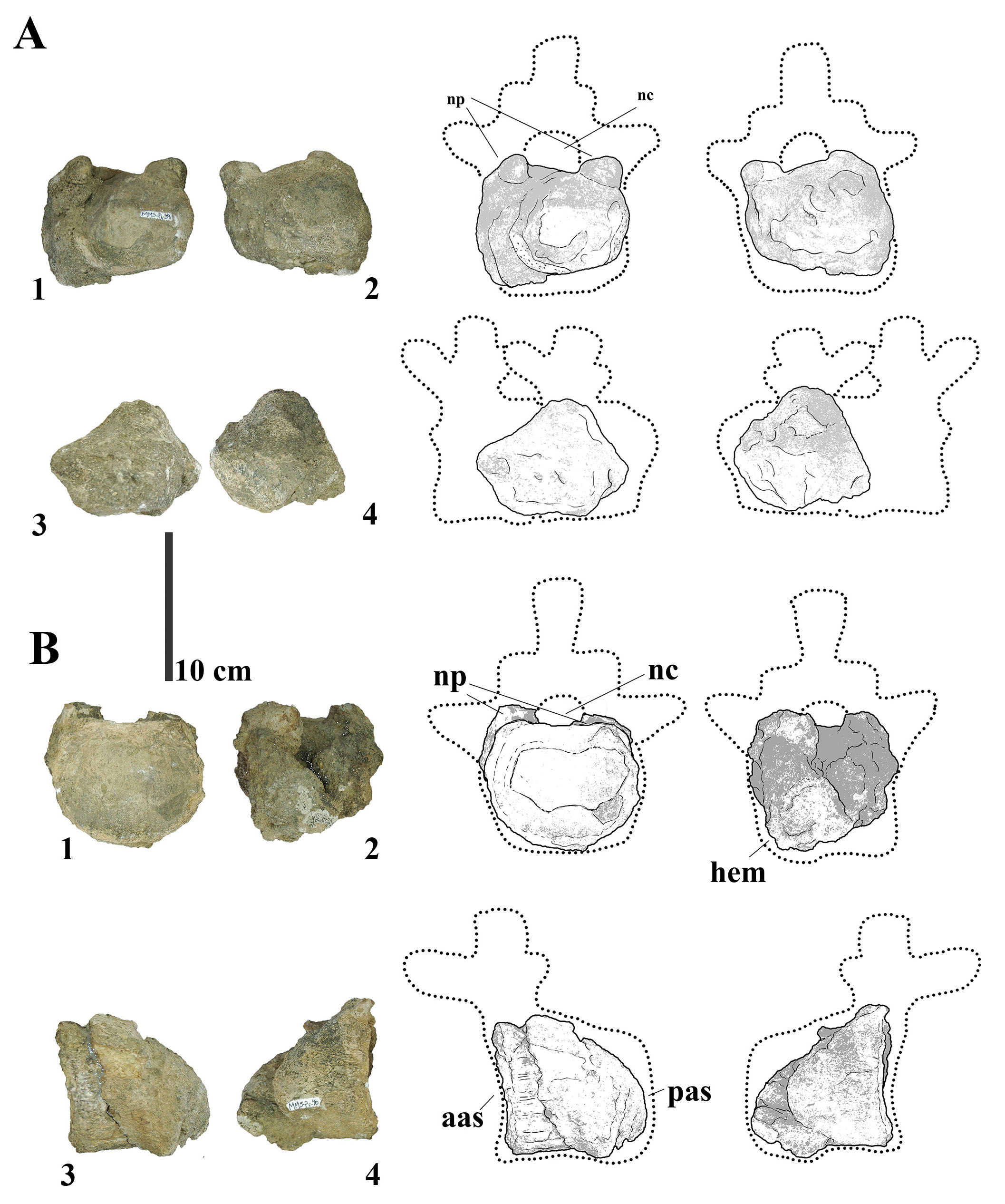 - (A) Photographs and line drawings of the fused caudal vertebrae of MMS-PV-40 in (1) anterior, (2) posterior, (3) left and (4) right views. (B) Photographs and line drawings of caudal vertebra MMS-PV-41 in (1) anterior, (2) posterior, (3) left and (4) right views. Abbreviations: aas, anterior articular surface; hem, haemapophysis; nc, neural canal; np, neural pedicels; pas, posterior articular surface.