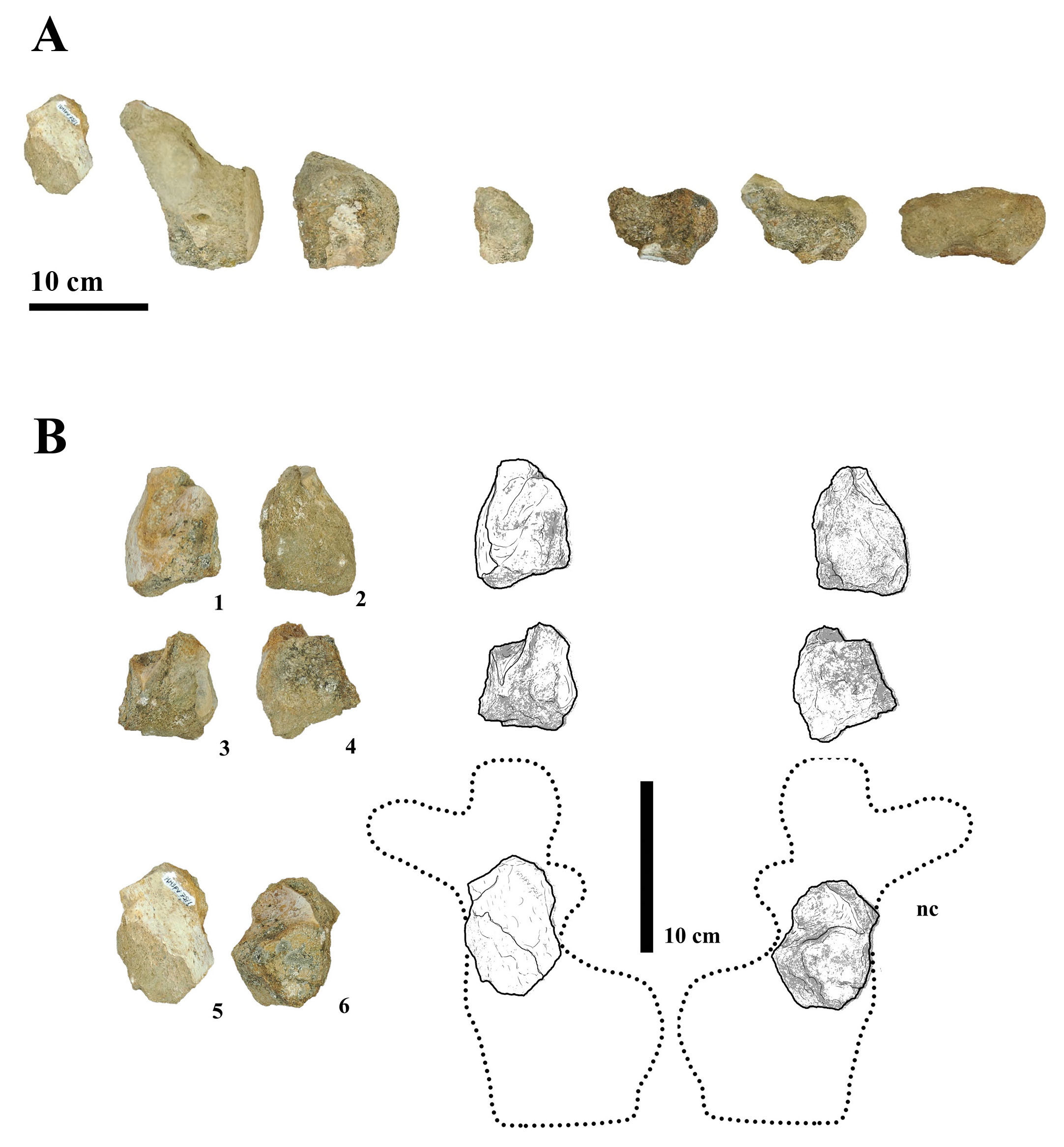 (A) - Caudal series of MMS-PV-75 in left view, in order from proximalmost to distalmost (left to right). (B) Photographs and line drawings of neural pedicel MMS-PV-75/01 in (1) dorsal, (2) ventral, (3) anterior, (4) posterior, (5) left and (6) right views. Abbreviations: nc, neural canal.