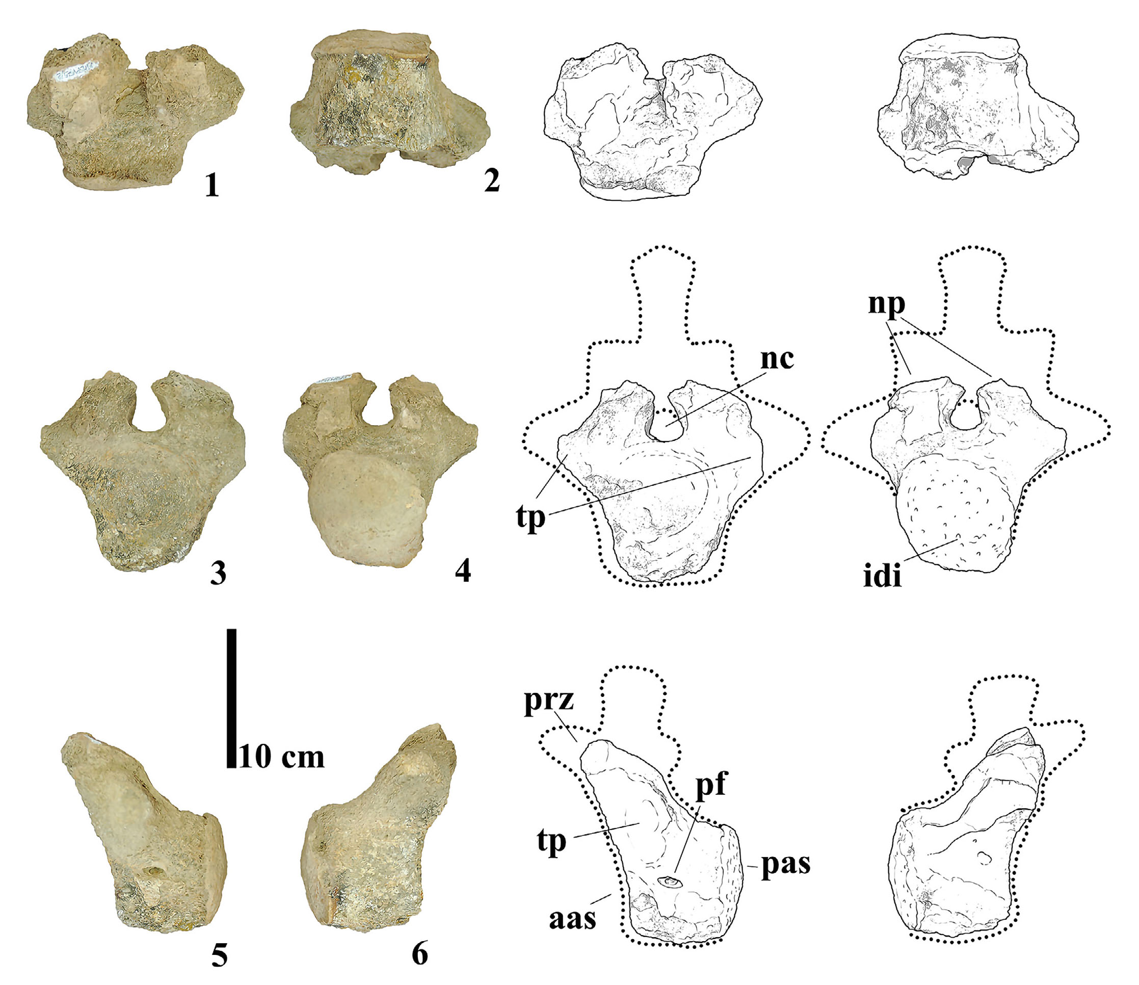 - Photographs and line drawings of caudal vertebra MMS-PV-75/02 in (1) dorsal, (2) ventral, (3) anterior, (4) posterior, (5) left, and (6) right views. Abbreviations: aas, anterior articular surface; idi, intervertebral disks impressions; nc, neural canal; np, neural pedicels; pas, posterior articular surface; pf, pneumatic foramina; prz, prezygapophysis; tp, transverse processes.