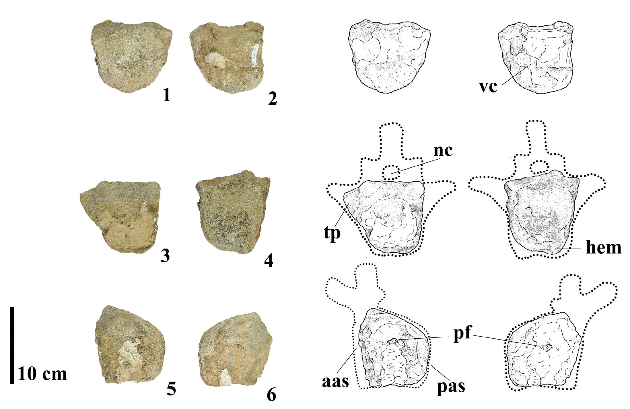 - Photographs and line drawings of caudal centrum MMS-PV-75/03 in (1) dorsal, (2) ventral, (3) anterior, (4) posterior, (5) left, and (6) right views. Abbreviations: aas, anterior articular surface; hem, haemapophysis; nc, neural canal; paf, posterior articular surface; pf, pneumatic foramina; tp, transverse process; vf, vascular foramina.