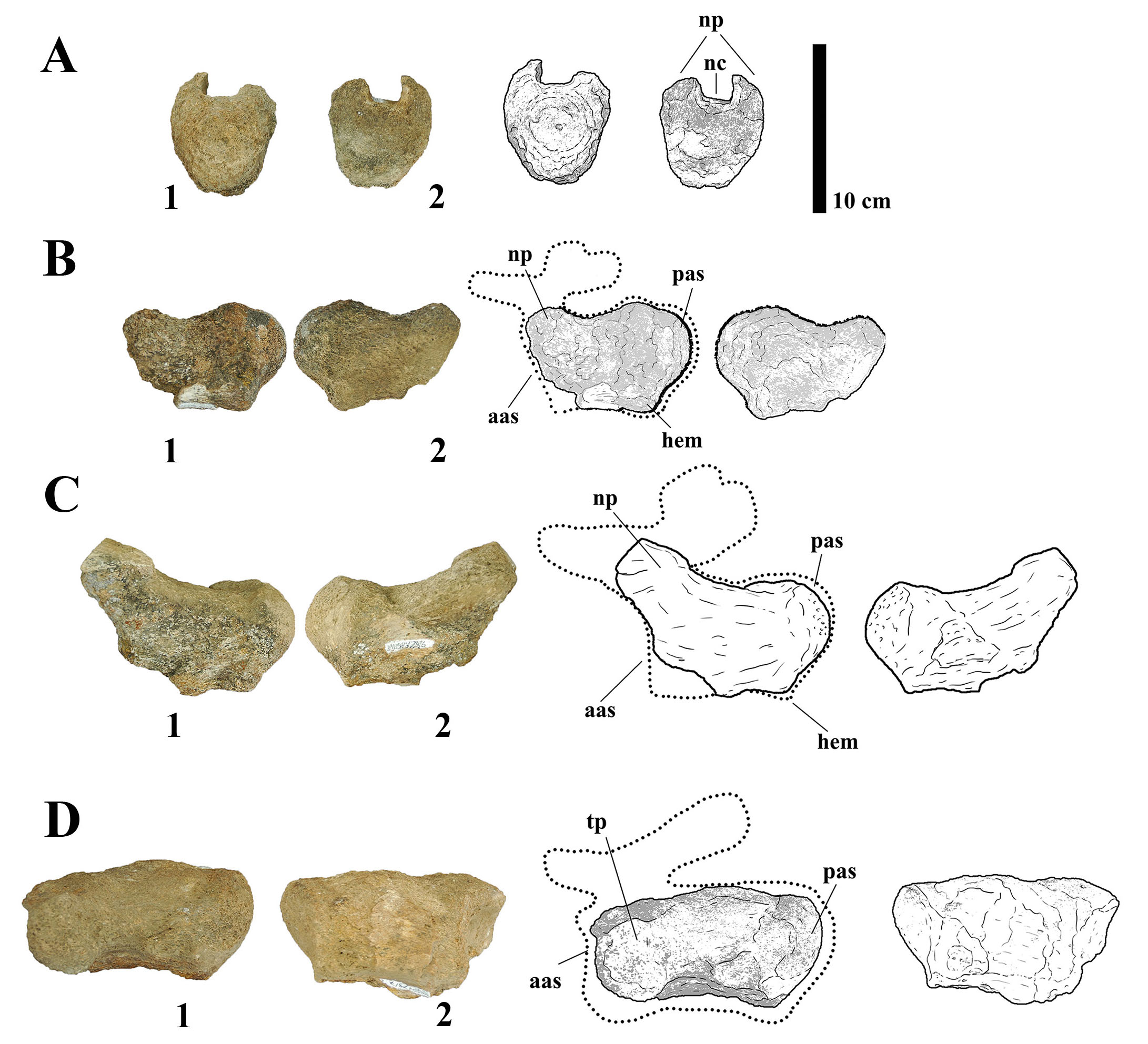 - (A) Photographs and line drawings of caudal vertebra MMS-PV-75/04 in (1) anterior, (2) posterior. (B) Photographs and line drawings of caudal vertebra MMS-PV-75/05 in (1) left and (2) right views. (C) Photographs and line drawings of caudal vertebra MMS-PV-75/06 in (1) left and (2) right views. (D) Photographs and line drawings of caudal centrum MMS-PV-75/07 in (1) left and (2) right views. Abbreviations: aas, anterior articular surface; hem, haemapophysis; nc, neural canal; np, neural pedicels; pas, posterior articular surface; tp, transverse process.