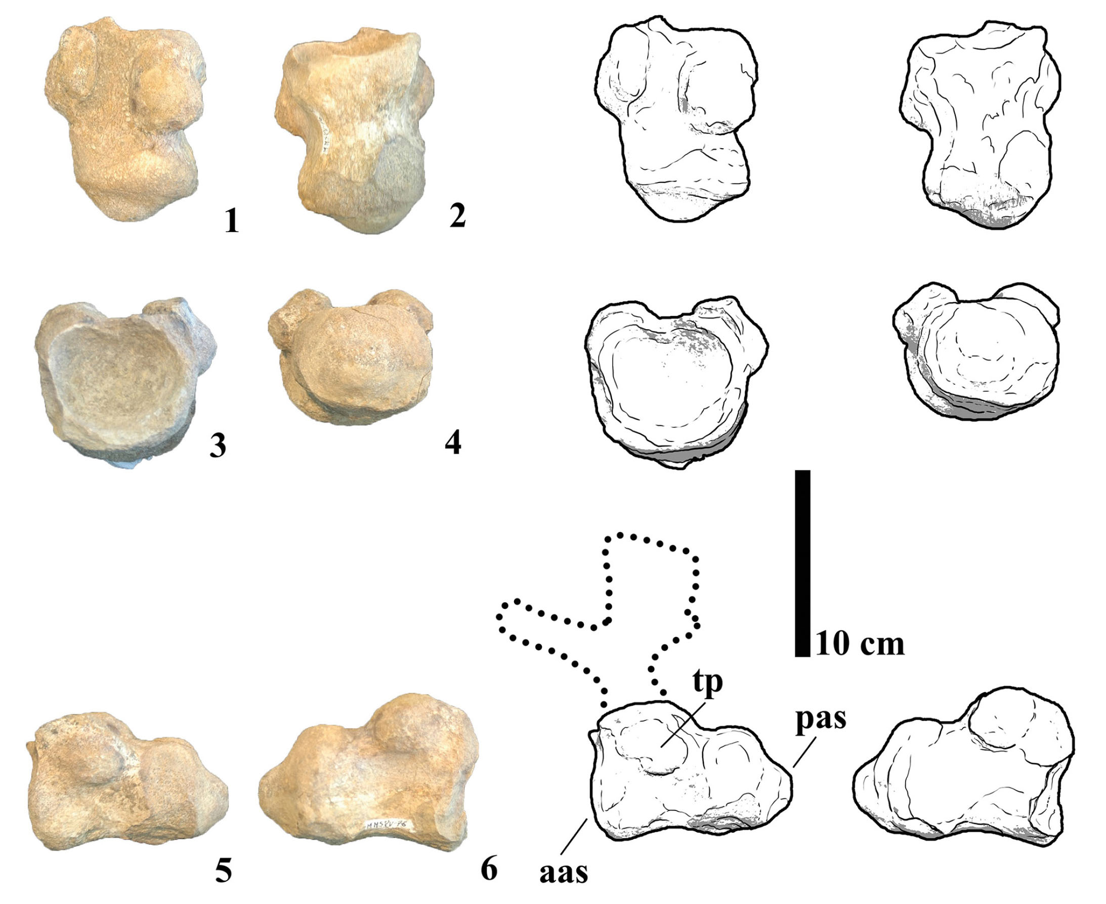 - Photographs and line drawings of caudal vertebra MMS-PV-76 in (1) dorsal, (2) ventral, (3) anterior, (4) posterior, (5) left and (6) right views. Abbreviations: aas, anterior articular surface; np, neural pedicels; pas, posterior articular surface; tp, transverse process.